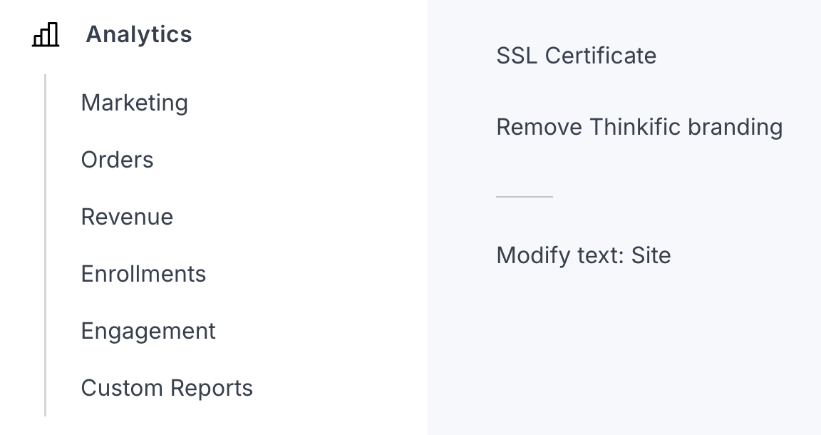 You can use a custom domain, so it looks like your own site rather than a subdomain of Thinkific's. The builder is template-based, but it gives you enough control over branding that the result feels like your own space. If you already have a website built on WordPress or another CMS, you can integrate Thinkific so that courses and products appear as part of your existing site rather than replacing it.