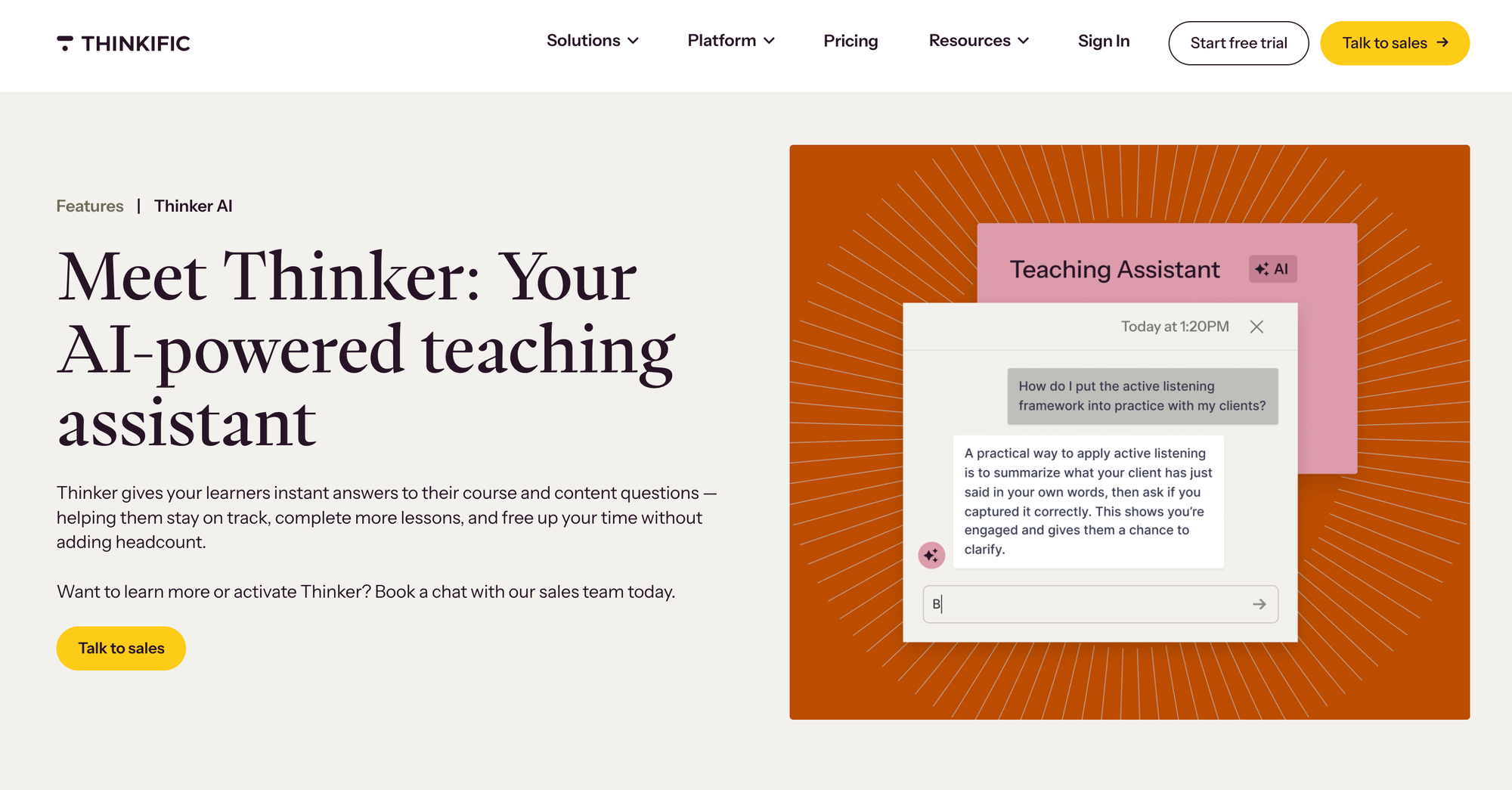 The most recent addition worth noting is Thinker, Thinkific's AI teaching assistant, which became generally available in February 2026. The idea is that you train it on your own course content and it can answer learner questions based on what you've already created, essentially acting as a first-line support layer that knows your material.