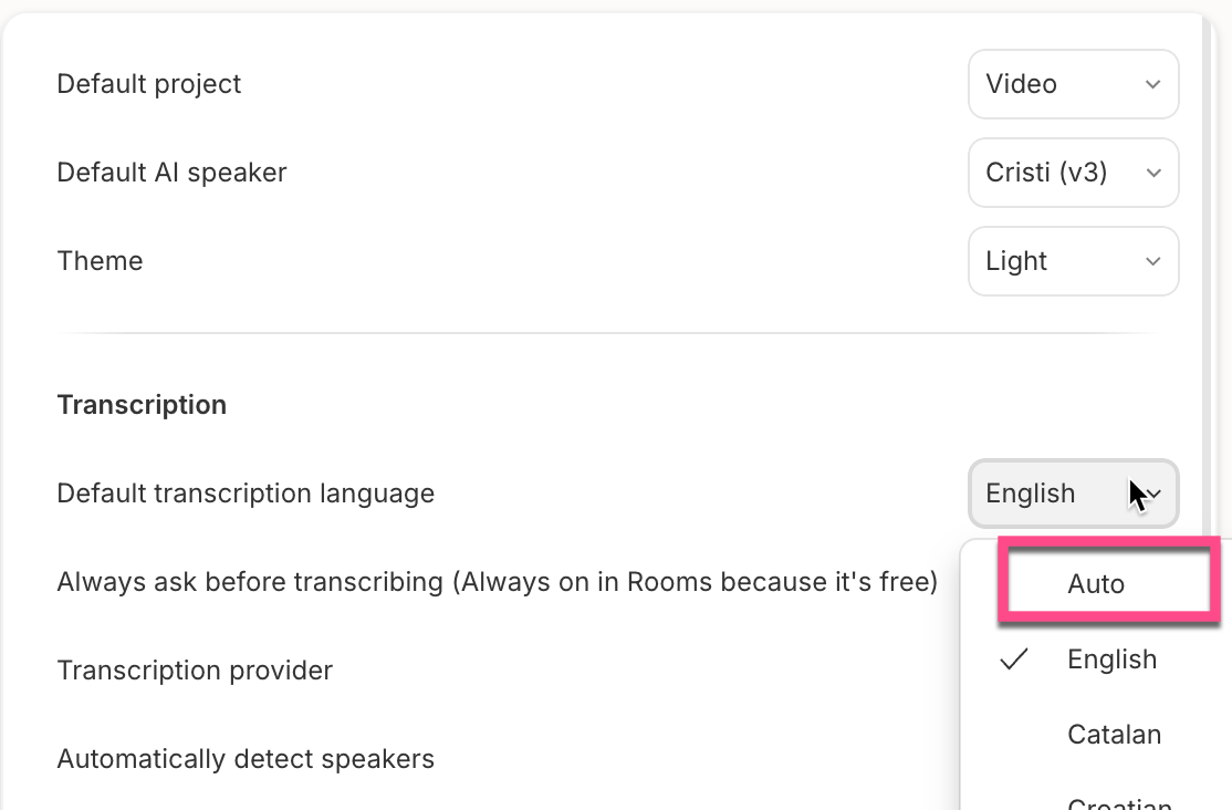 - Under Default transcription language, pick the language you use most (e.g. English) instead of Auto