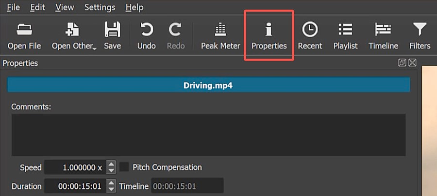 Step 2: With the video selected, click on “Properties” in the top bar, to bring up the properties panel on the left.
