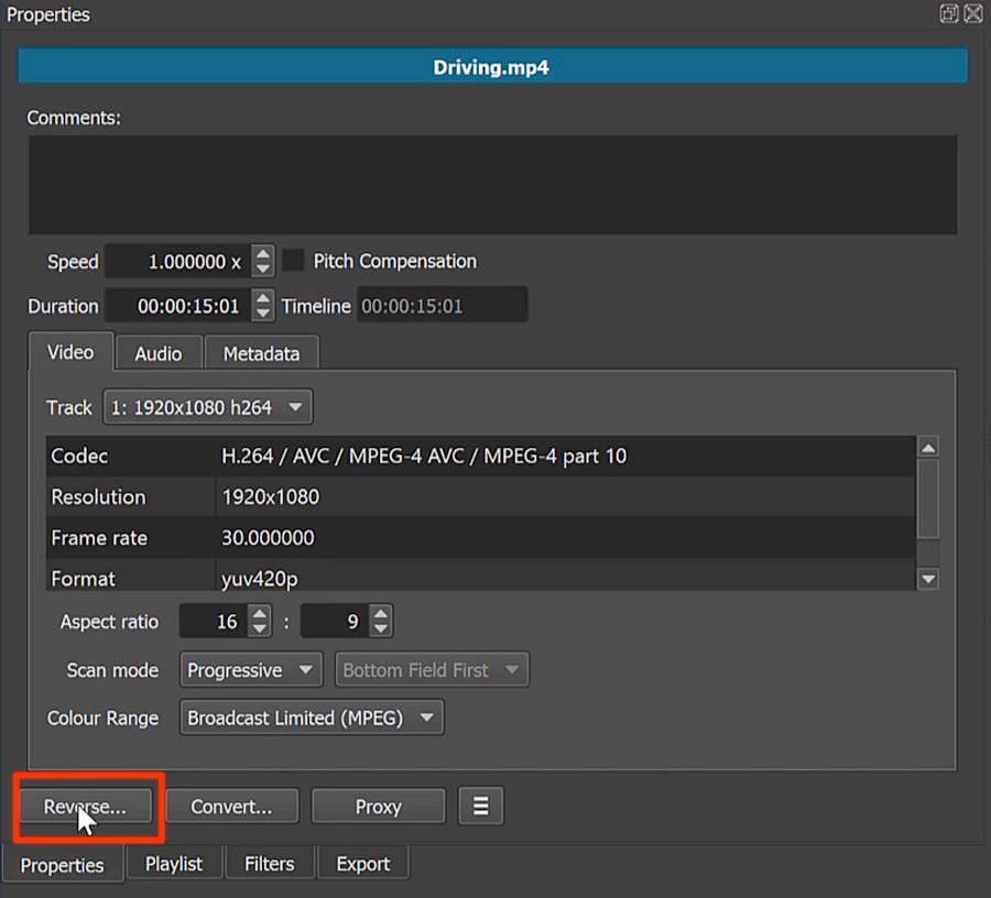 The Reverse function in Shotcut is at the bottom of the properties for the clip
