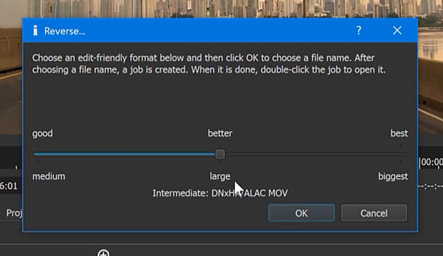 Clicking “Reverse” will bring up a panel with a slider where you can choose the quality of the conversion. If you intend to edit the video further, it may be best to move the slider towards “best.”
