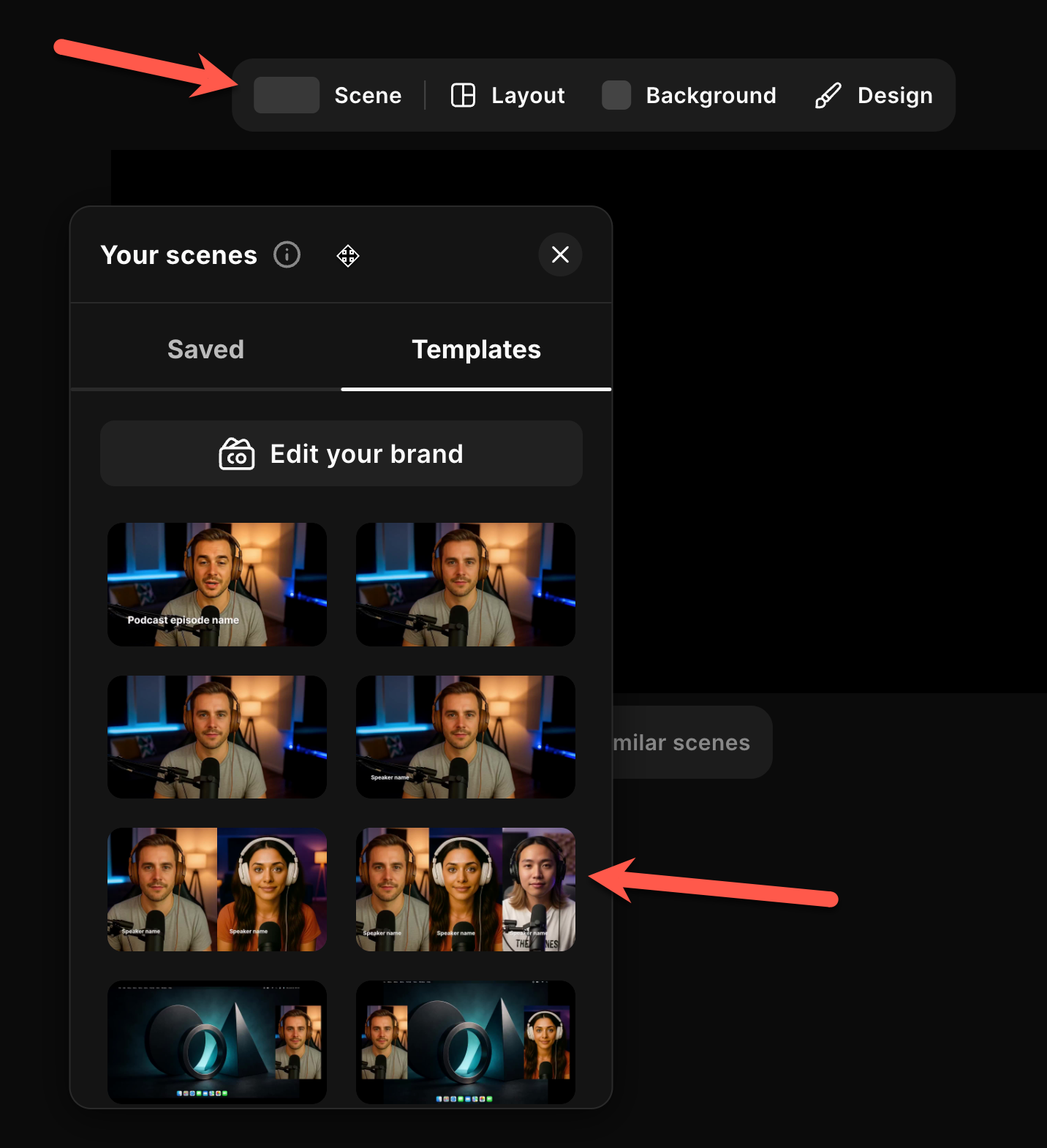 Once you've set up your names, titles, and branding the way you want, save it as a reusable scene design. This way you won't have to recreate the layout for every episode — just load your saved scene and update the names.