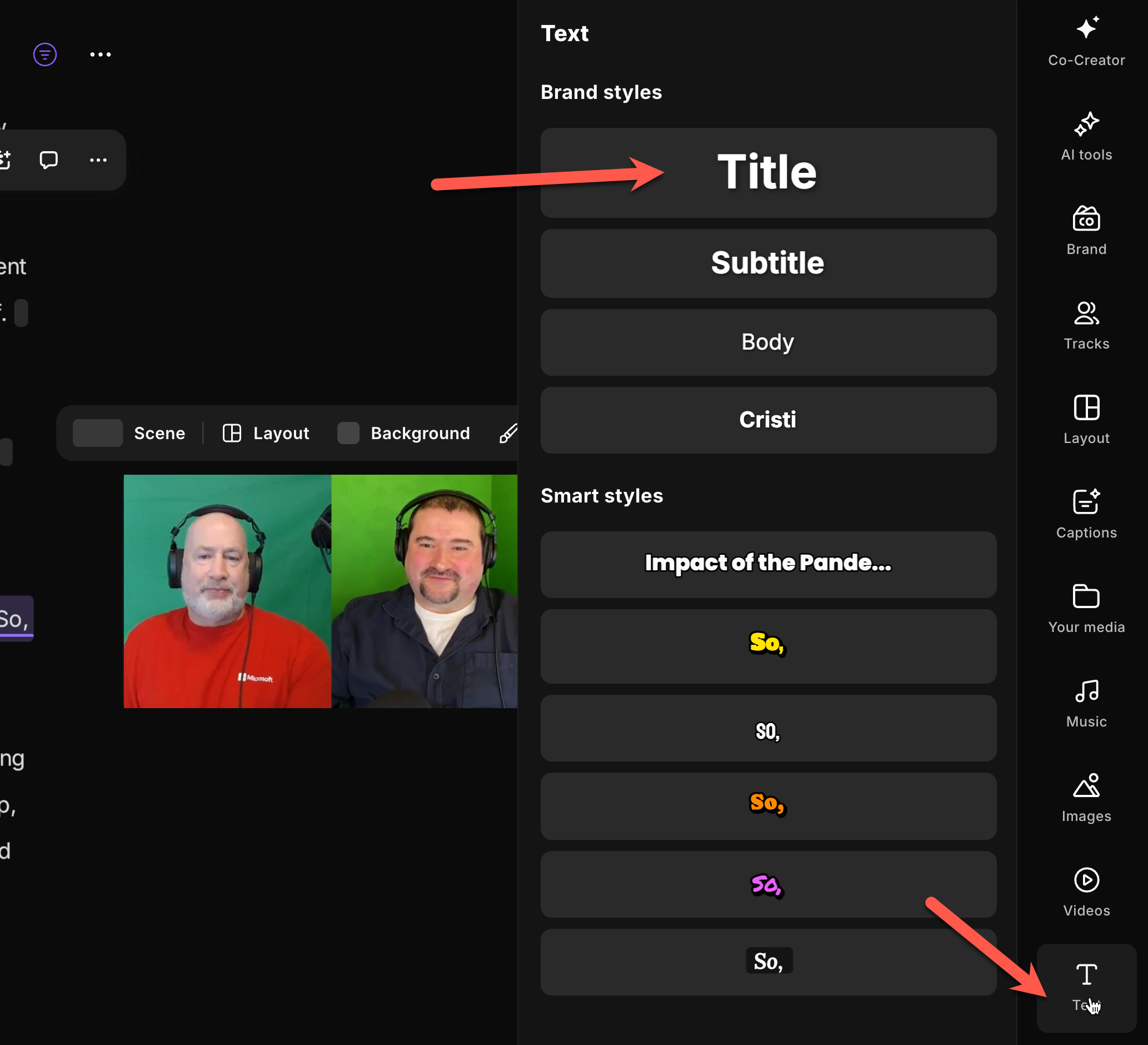 When you open your recording in the Riverside Editor, you can add names and titles back using text fields or templates and the Brand Kit.