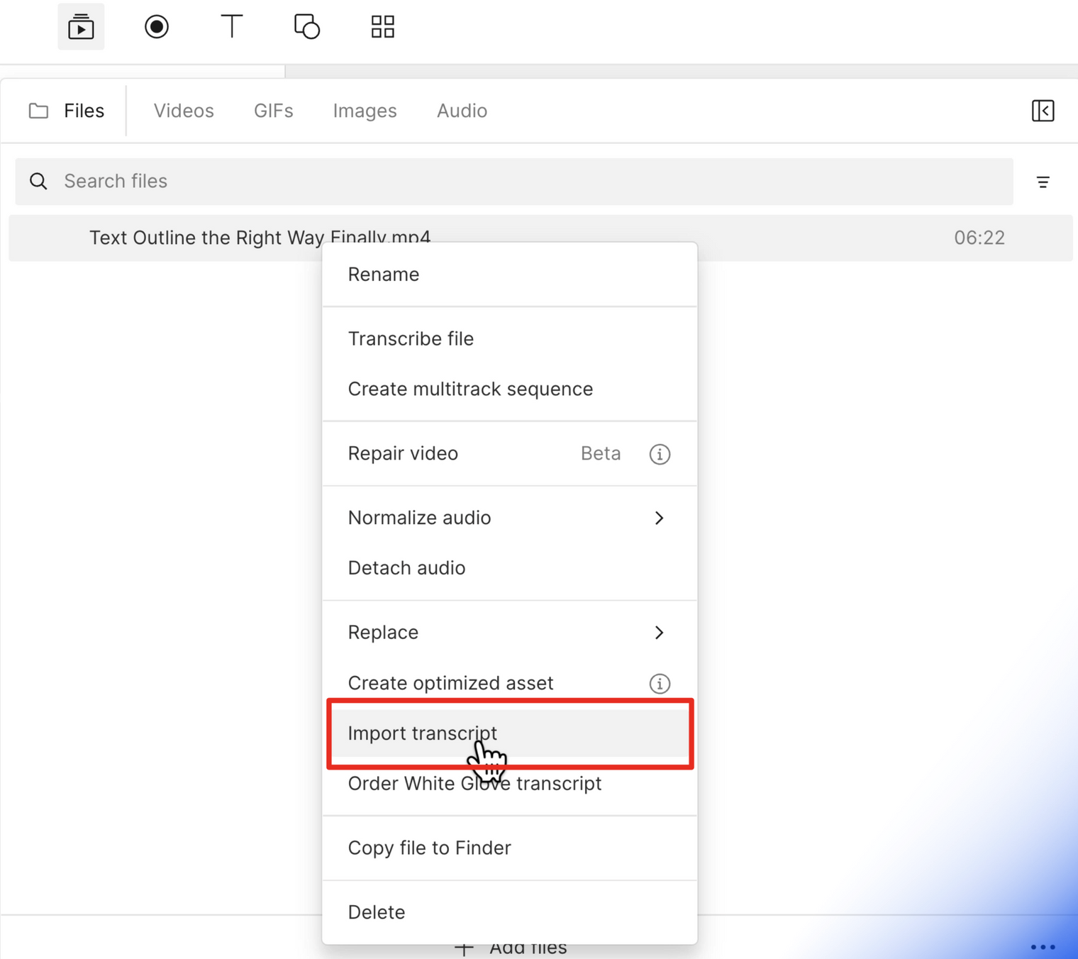 Step 2: Right-click on the file and Import Transcript