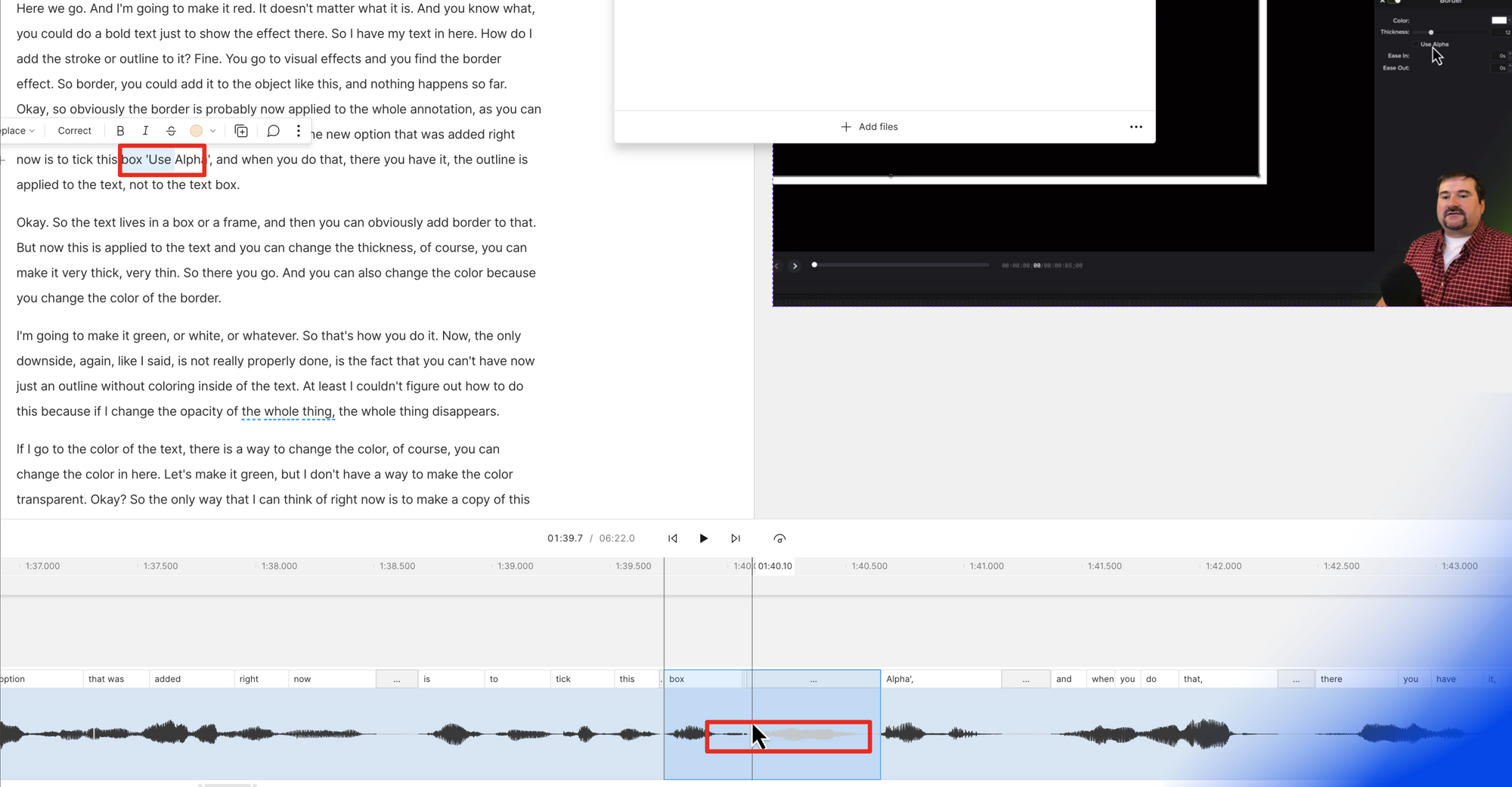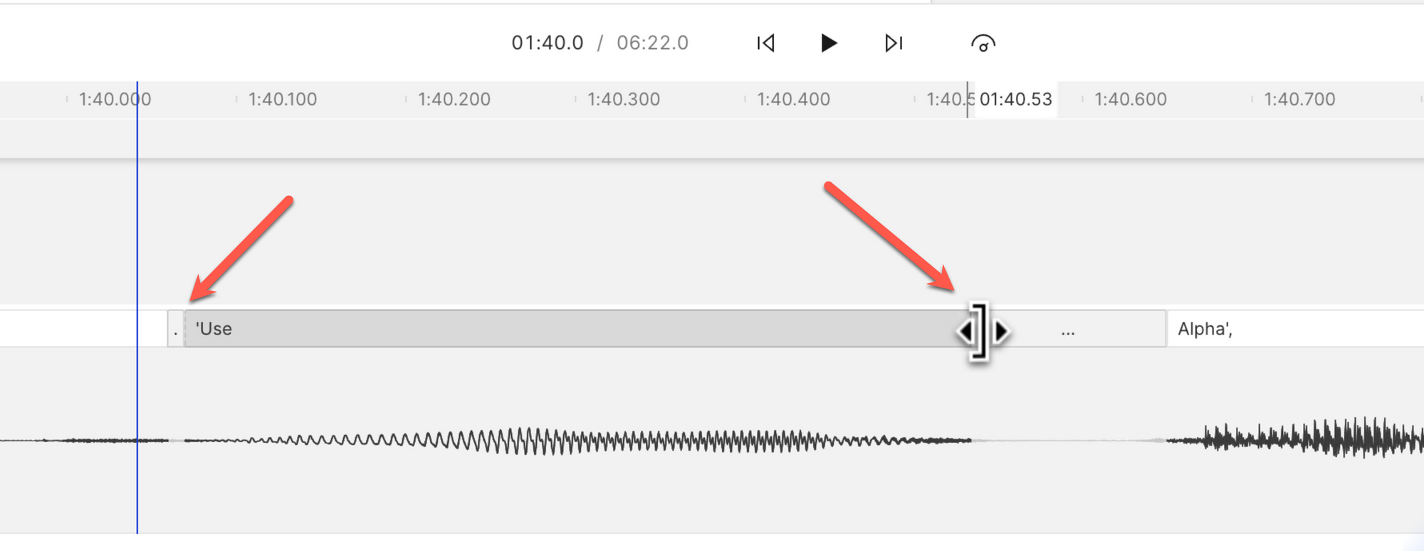 You can see how the word appears in the transcript but the waveform is greyed out, which means the word has either not been recognized or it has been mis-aligned.