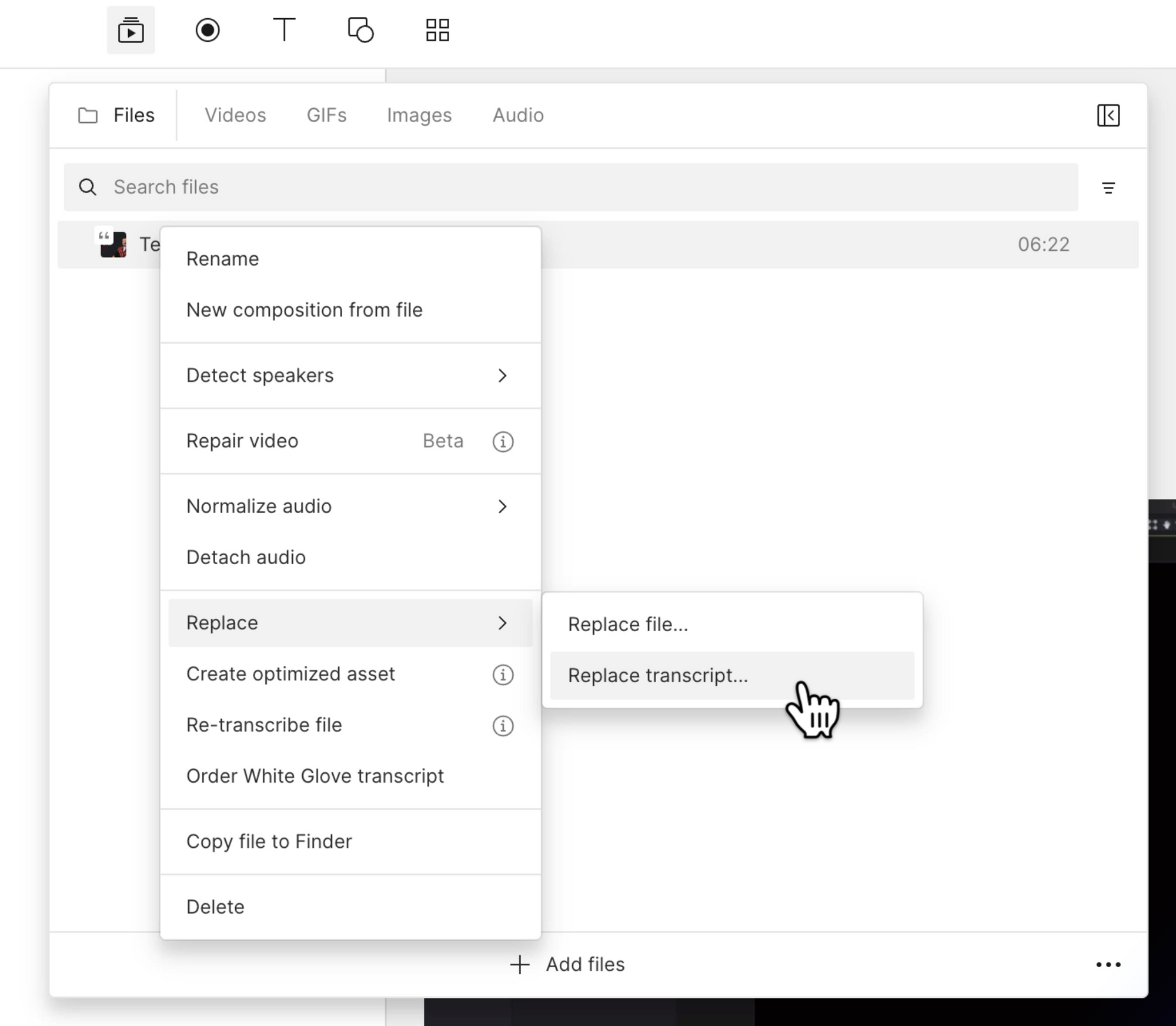 If you've previously transcribed a file in Descript but wish to replace it with a corrected external transcript, here's how: