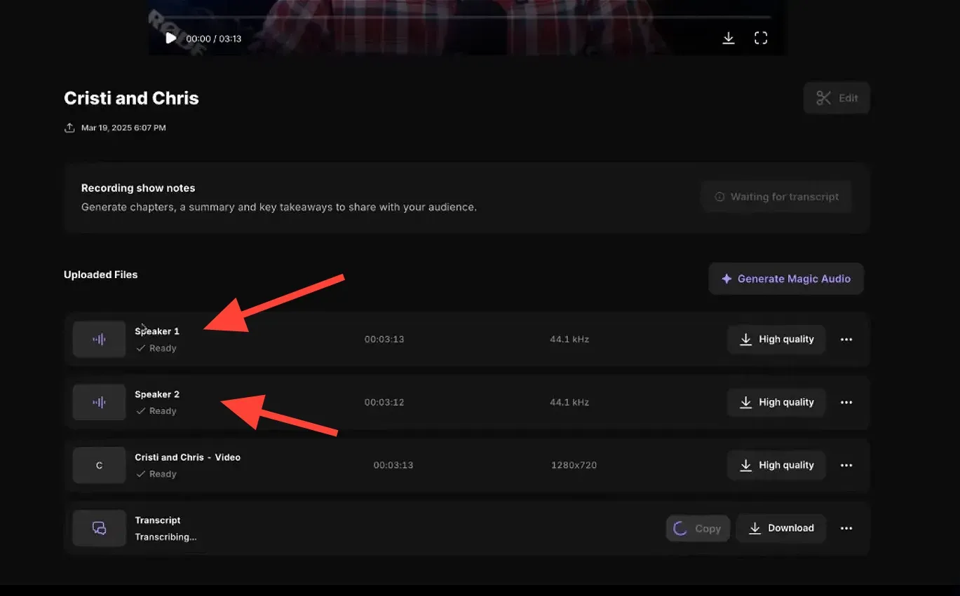 Once you’ve separated and named the tracks, you can apply Riverside’s "magic audio" settings to enhance the audio quality further. This feature lets you adjust settings specifically for each track, ensuring that both speakers are heard clearly and with the best possible sound quality.